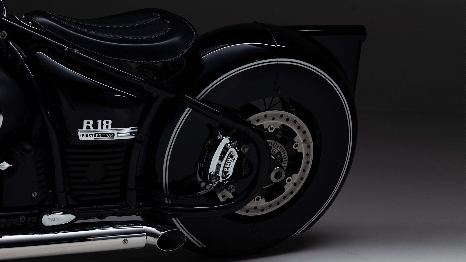 Panel wykończeniowy pasuje do zbiornika paliwa z odstępem wynoszącym zaledwie 8 mm. Tradycyjna kolorystyka z charakterystycznymi podwójnymi liniami jest praktycznie bezproblemowo kontynuowana na tym imponującym, ręcznie wykonanym elemencie. Nie trzeba dodawać, że lakier zdobi również osłonę tylnego koła, która obejmuje niewiarygodny kąt 310 stopni i doskonale uzupełnia stylistykę przodu pojazdu. Mechanizm zawiasowy umożliwia zmianę koła w tym motocyklu. Precyzyjnie rozmieszczone otwory dają widok na hamulec tarczowy i układ napędowy. Tutaj też staje się jasne, co stanowi duszę Spirit of Passion: podchodzi on z najwyższym szacunkiem do designu R 18, stając się jednocześnie prawdziwym arcydziełem.