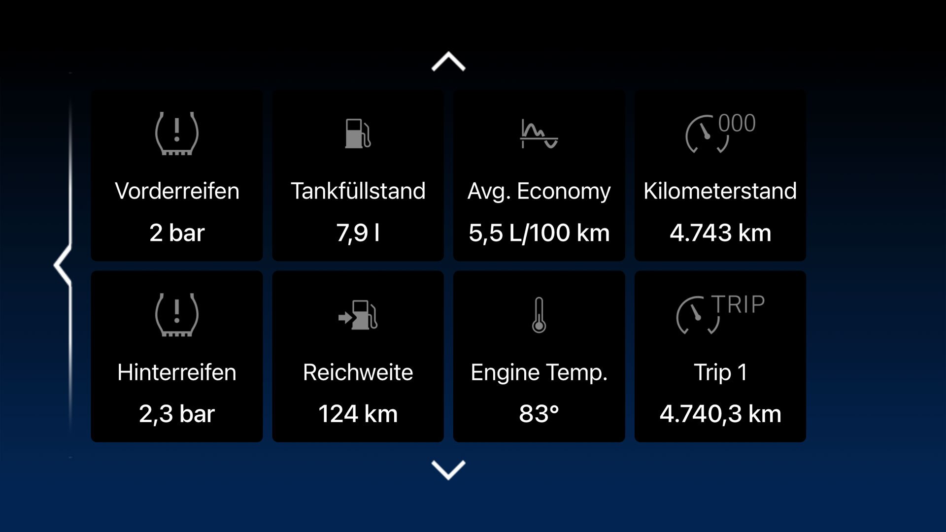 Aplikacja BMW Motorrad Connected jest kluczem do BMW Motorrad ConnectedRide Cradle. Po sparowaniu przez Connectivity Hub aplikacji uzyskujesz dostęp do funkcji za pomocą sterownika wielofunkcyjnego. Nawigacja prowadzi cię poprzez widok mapy i strzałek najlepszą drogą do następnego celu. Później masz również dostęp do pokonanej trasy. Obszar Bike Info zawiera dodatkowo wszystkie ważne dane pojazdu, takie jak ciśnienie w oponach, wskaźnik zużycia paliwa i zasięg.